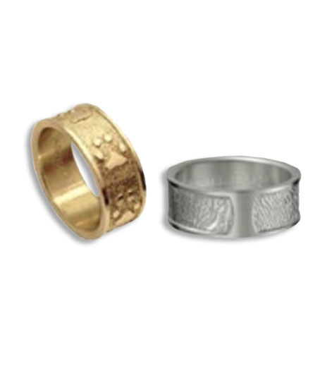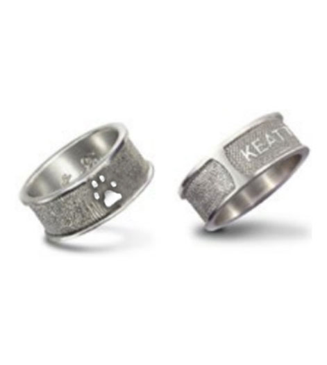 This is an very unique ring that was designed by In Loving Paws. You can have either a nose/paw print engraved on the band along with your pet’s name. you then have your choice of a stone or a paw print opposite your pet’s name and you also have the option of adding some of your pet’s ashes to the resign coating the exterior of the ring.